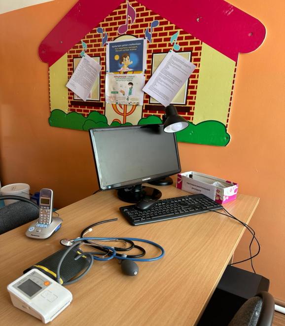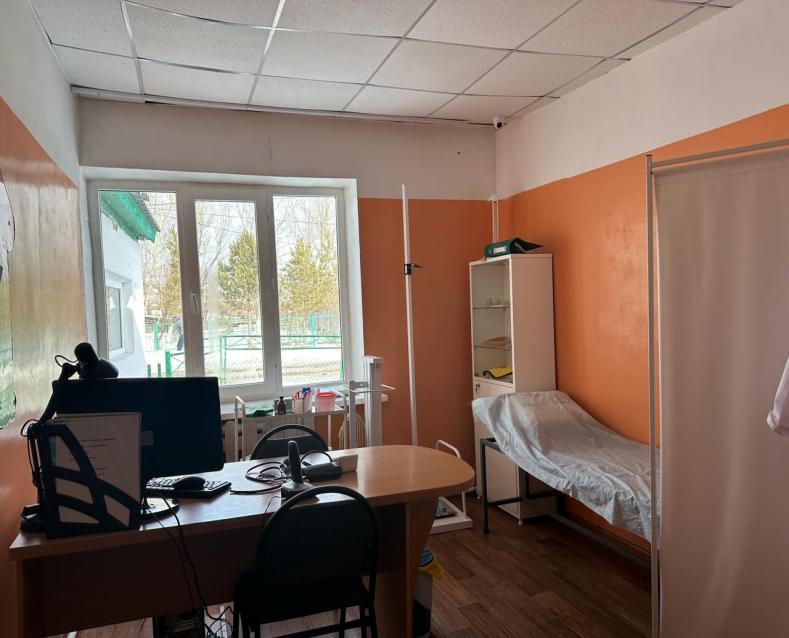 (1)стол, (2) орындық, принтер,(1) компьютер,(2) шкаф, таразы, бой өлшегіш, медициналық төсек, тоңазытқыш, қоқыс шелегі, төсек, ширма, (1) шкаф ,горшок.